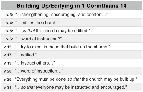 (2) Tongues are unintelligible and unedifying to the group (1 Cor. 14:2-4, 6, 19) but are edifying to the speaker (v. 4).