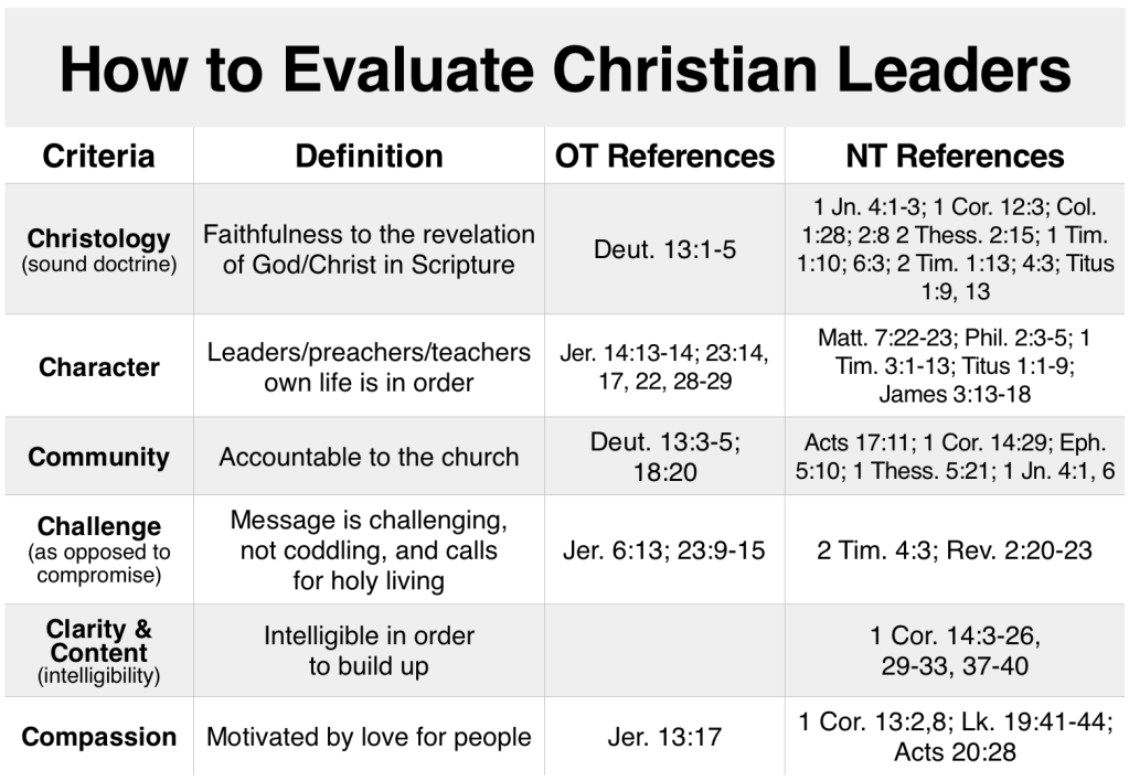 So, let’s look at some biblical criteria by which to evaluate Christian leaders. It should be understood that these criteria do not have the same weight. The criteria of “Christology,” for example, should be given more weight of importance than “Clarity.”