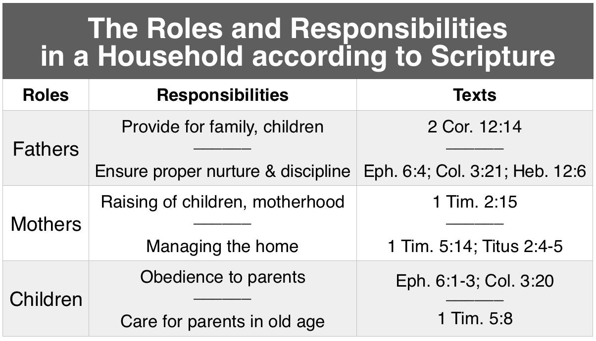 First, it is important to glean principles from the Bible to answer this question. The first principle or truth that I think is relevant is that God made humans gendered. The Bible clearly teaches that males and females are both made in the image of God (Gen. 1:26-27) and yet males and females differ from one another in some respects to various degrees. Scripture also teaches that within the family and within the church God has given complementary roles and gifts. For example, see the table from God, Marriage, and Family by Andreas Kostenberger: